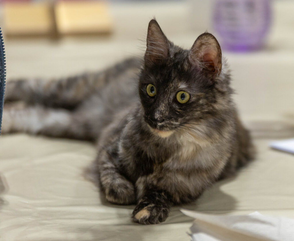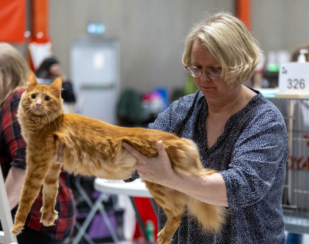 Slutligen fick Maja visa upp sig på domarbordet, som vanligt som sista katt för dagen. Hon gjorde det bra på sitt vanliga vis och växlade mellan att frenetiskt jaga vippor och leksaker och att lugnt rulla runt på bordet. Även hon fick en fin bedömning och tog sitt andra cert i öppen klass. Nästa utställning har hon chans på titeln Champion men vi får se när det blir – förhoppningen är att en kull kommer mellan!