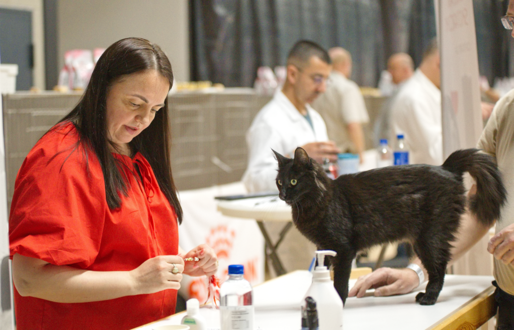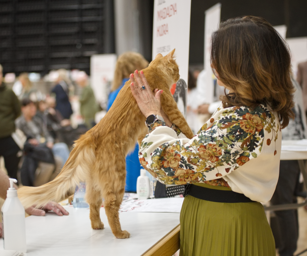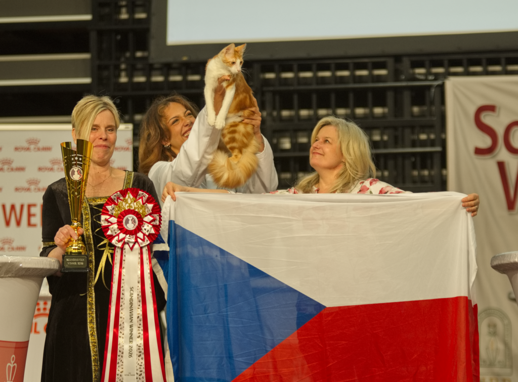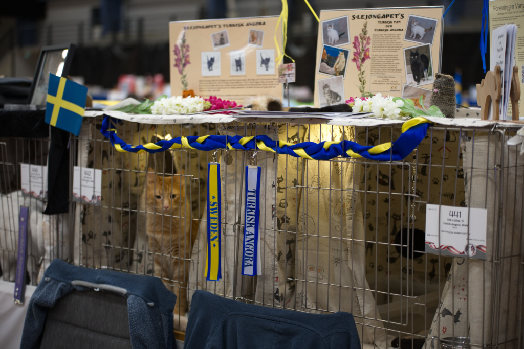 På kvällen är det bankett med stor baluns men vi drog oss tillbaka till husvagnen och lagade lite god mat i lugn och ro med pojkarna – det är ju en söndag också! På söndagsmorgonen är det ingen incheckning och buren är ju redan klädd så det känns lite lyxigt att bara glida in och placera katterna på sina platser. Då det är en stor utställning med många domare blir det stora paneler i kategori två som Turkisk Angora hör till var det nio katter som möttes i varje panel. Tack vare bra systemstöd och effektiv organisation flöt allt på bra och man kunde följa det hela på storskärm och jumbotron så man visste när det började bli dags för de egna katterna. Deltagarna kom från många olika länder men det är klart att jublet var högst när en katt från Danmark, Sverige eller Norge vann då det var flest utställare därifrån.