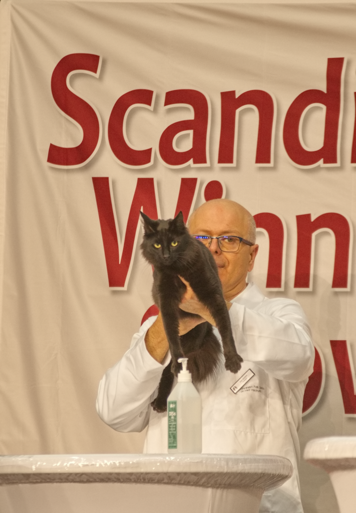 Vi kom fram efter en lugn resa med flera raster, under två av dem som var lite längre fick pojkarna vara lösa i husvagnen så att de fick tillgång till mat, vatten och låda, efter drygt 13 timmar och kunde ställa upp oss. Nästa morgon var det dags att checka in, pynta bur och komma i ordning. Det var en stor hall och runt 800 katter anmälda! Vinnarutställningar är alltid två dagar med bedömningar och nominering till panel på lördagen och panelerna, själva finalerna, på söndag.